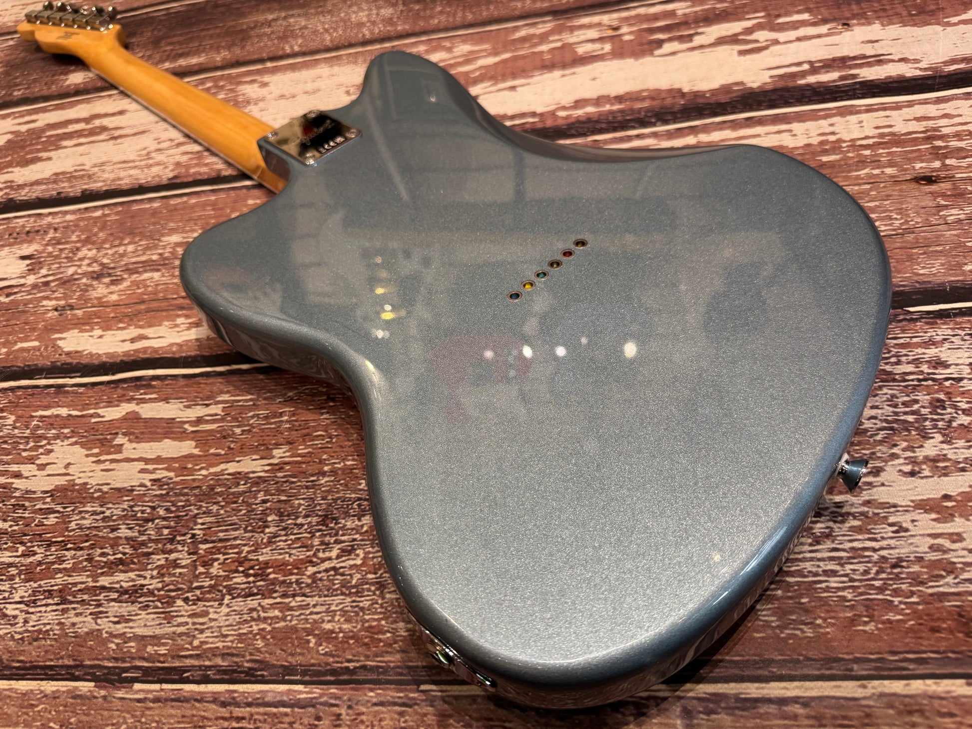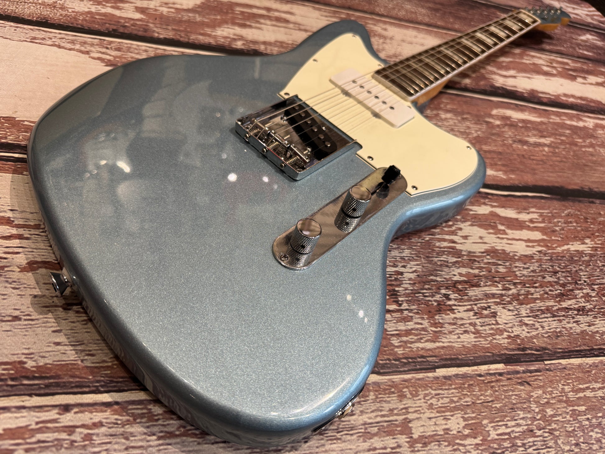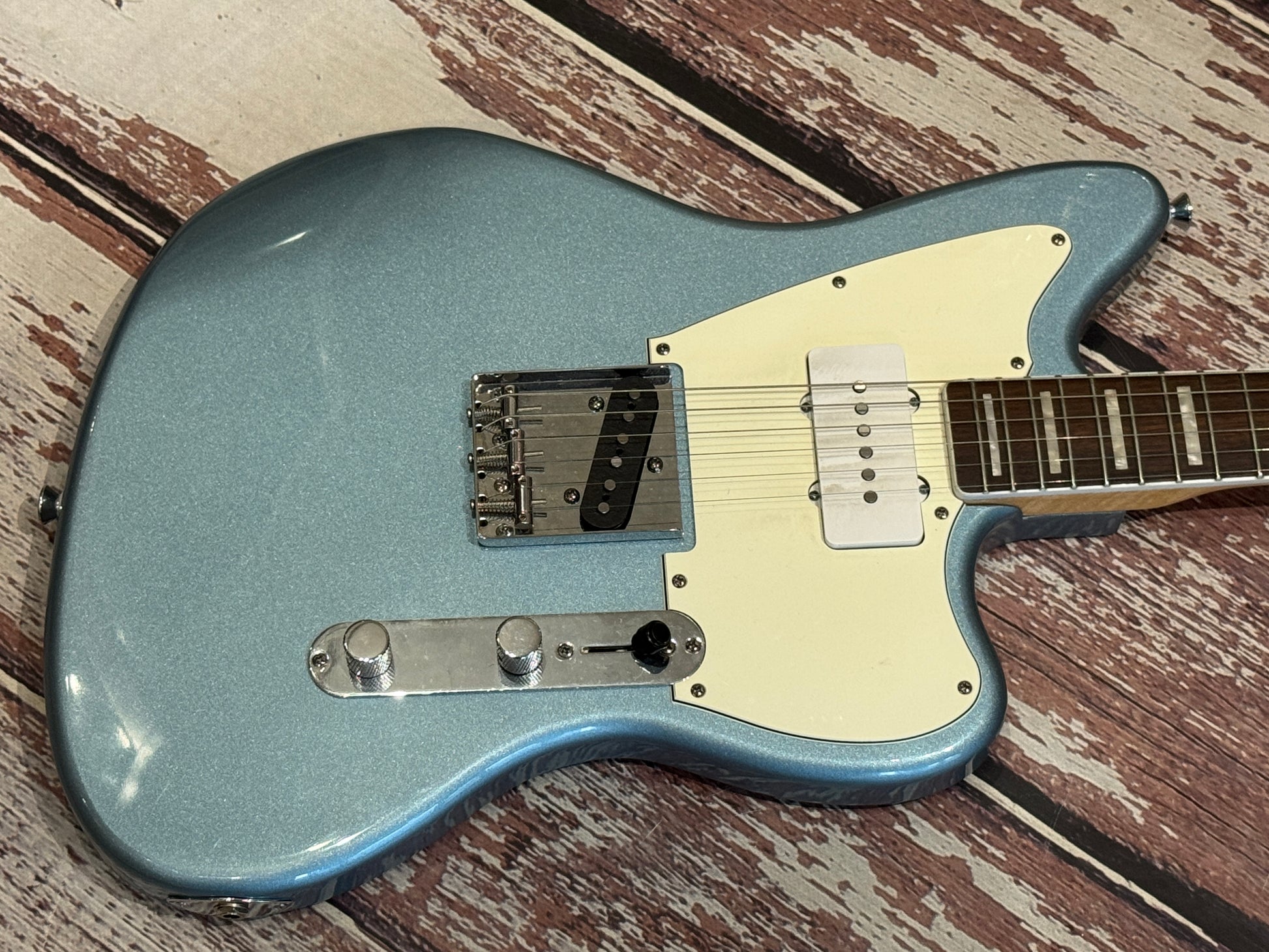 It really is 50% Tele and 50% Jazzmaster, taking a pickup from each guitar, the neck and body from the 2 guitars and this one is finished in ice blue metallic.