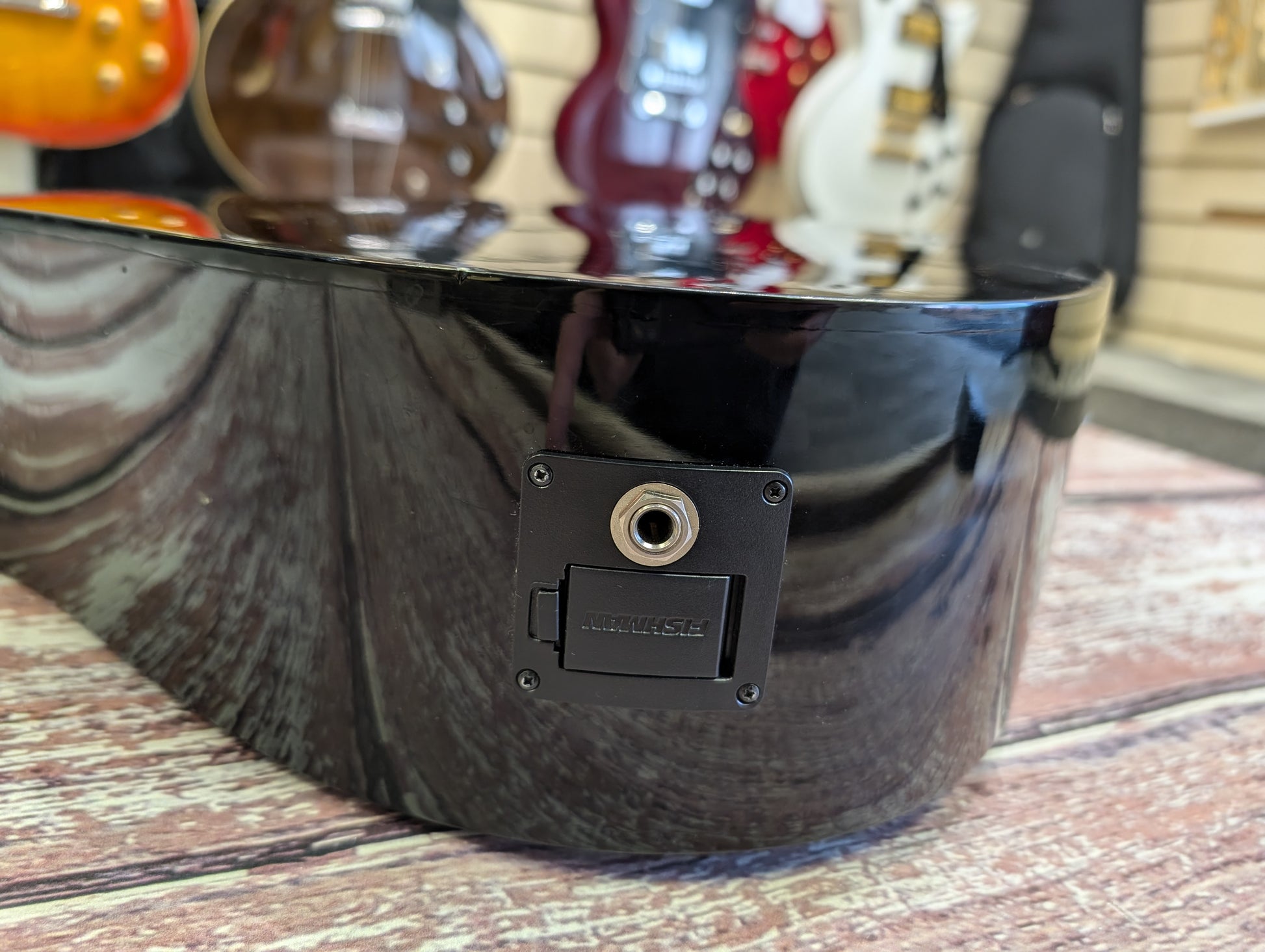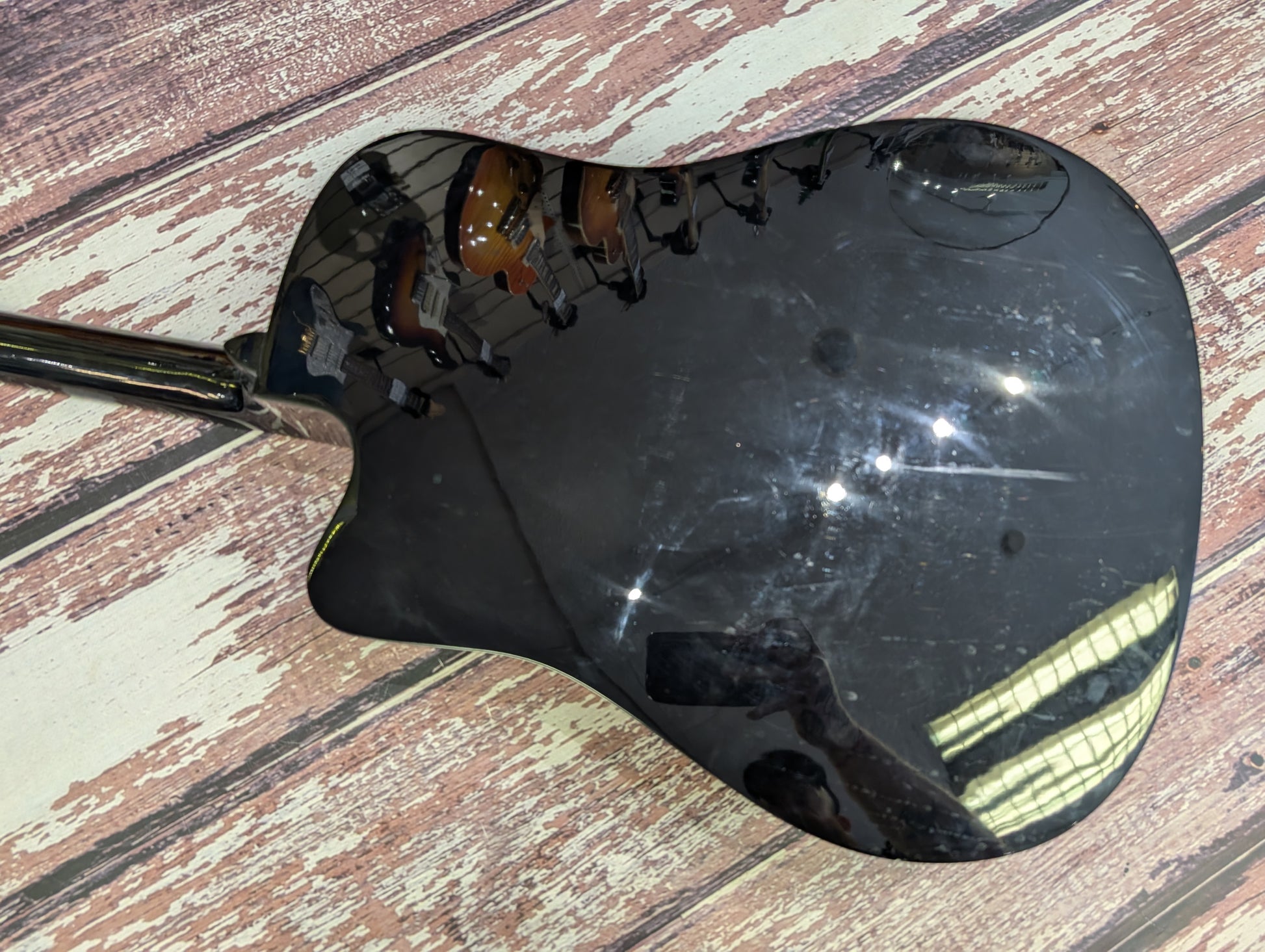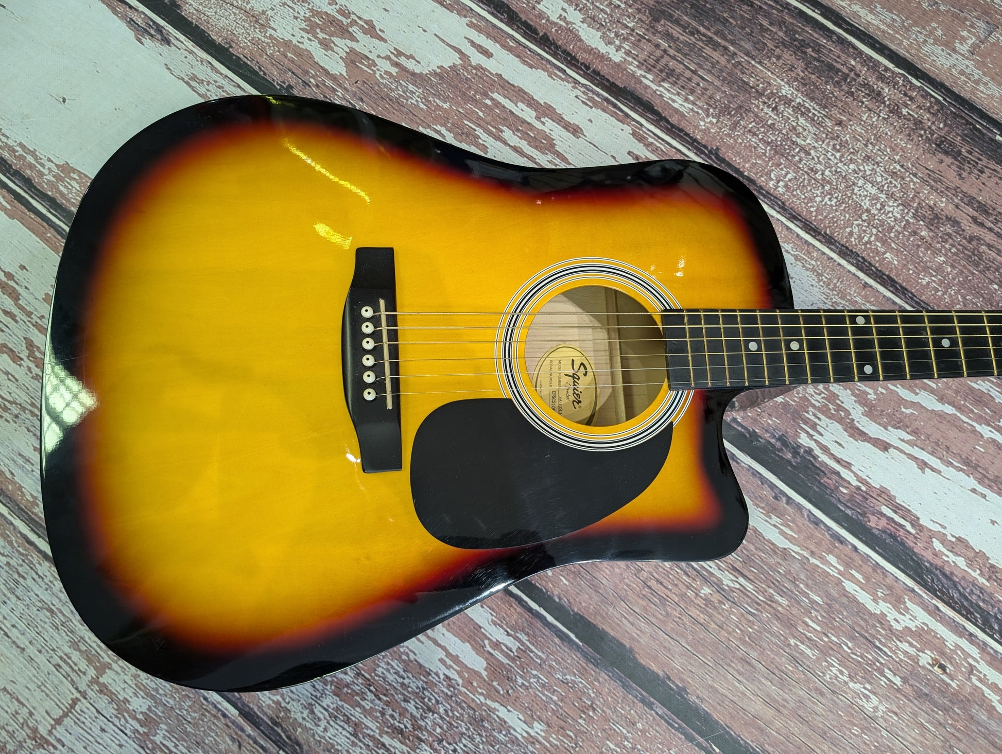 A simple cutaway Dreadnought sized acoustic, from Squier. All laminate build and 'stained hardwood' fingerboard (which has had stain lightly worn away around the cowboy chord area) bring this down to a value that's perfect for either a beginner, or as kickabout sofa strummer. Also fitted with a Fishman preamp which punches above its weight for a plugged in tone.