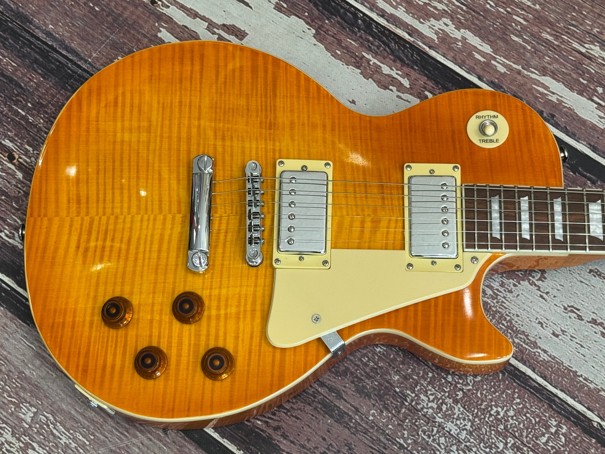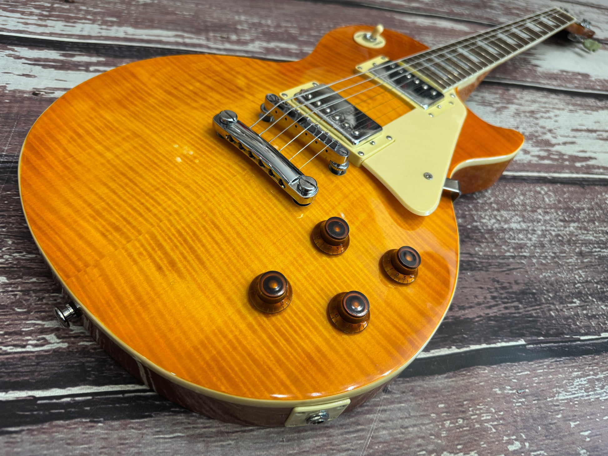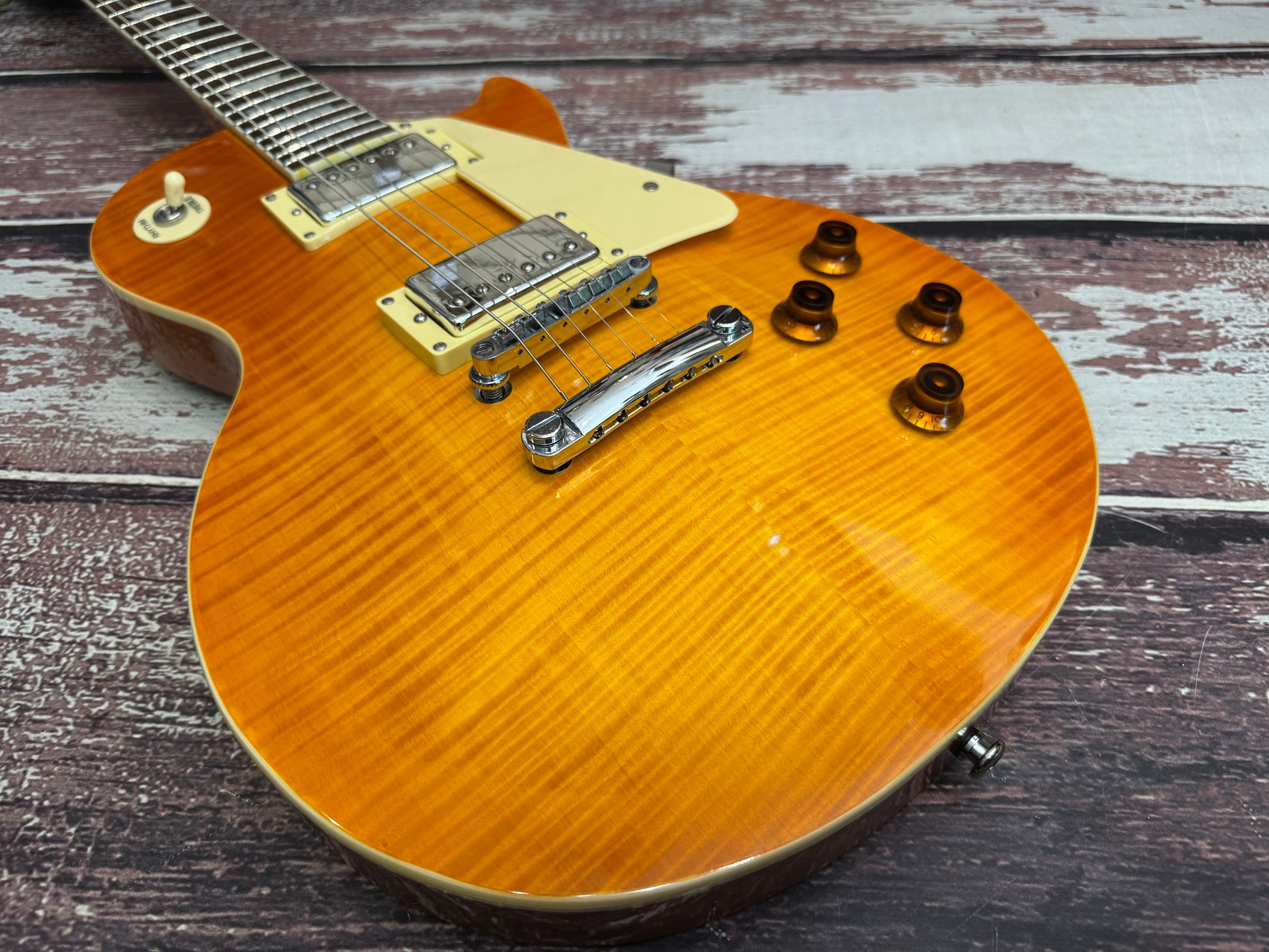 This one is a "faded" sunburst so you have a hint of orange on the edge of the guitar through to lemon, and all of this in a wonderful flame top.