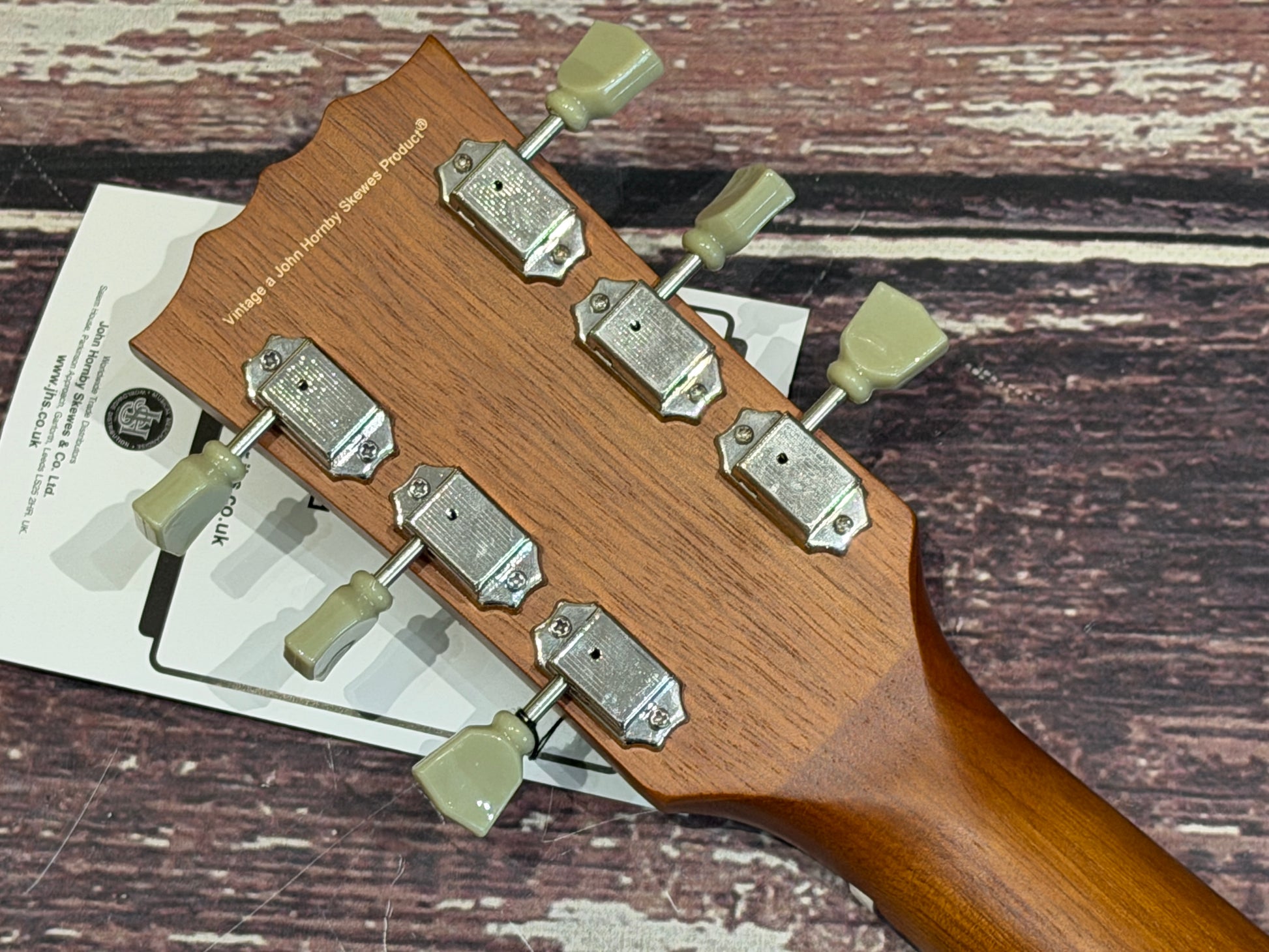 Stunning cosmetic features for this beautiful model also include contrasting black/white/black body binding and soundhole rosette design, classic 3-aside headstock with gold Vintage logo, and attractive split-block, white inlaid fingerboard position markers.