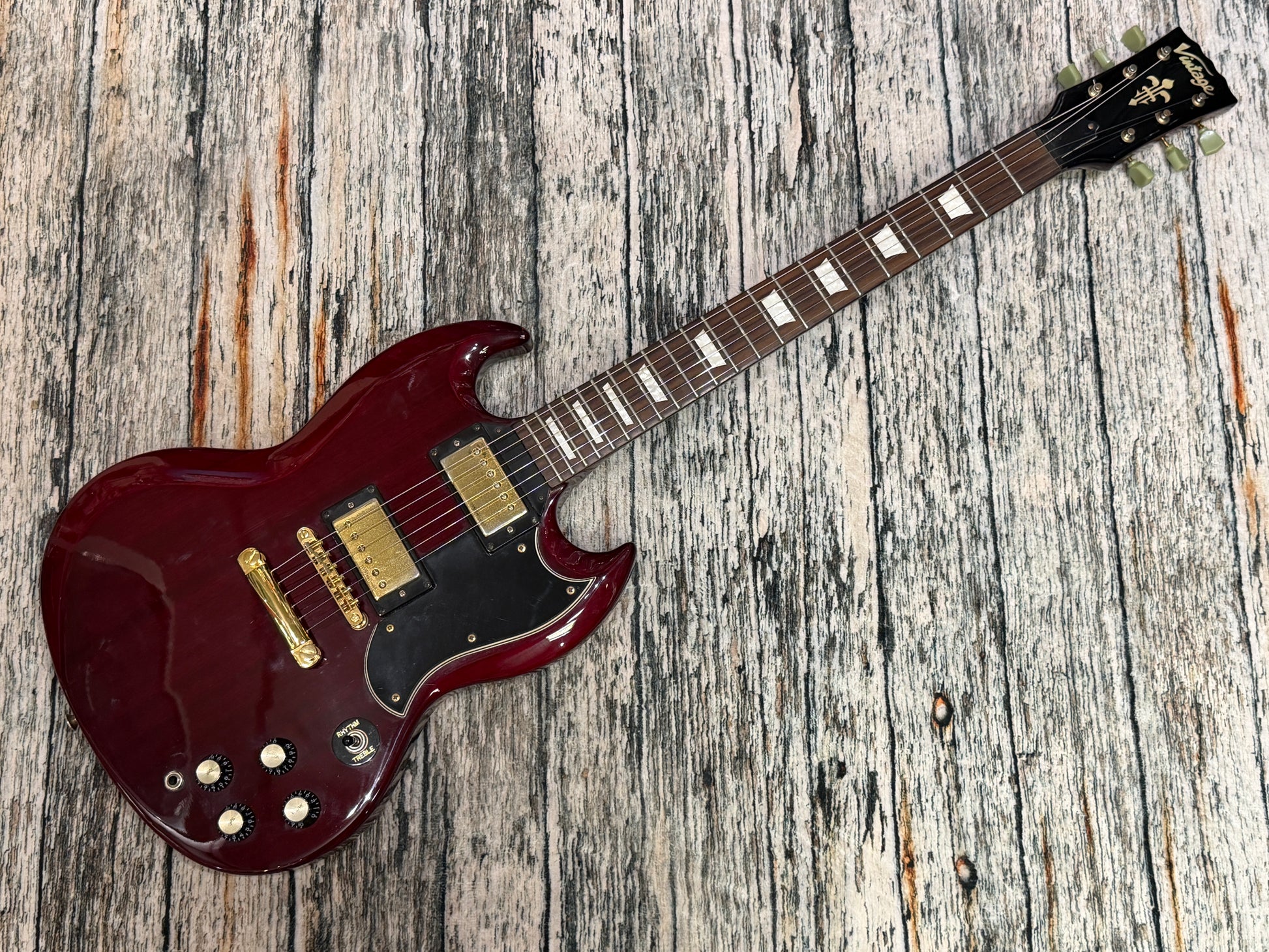This lovely Vintage model is the VS6 based on the SG with twin humbuckers, individual volume and tone controls and a 3 way pickup toggle switch.