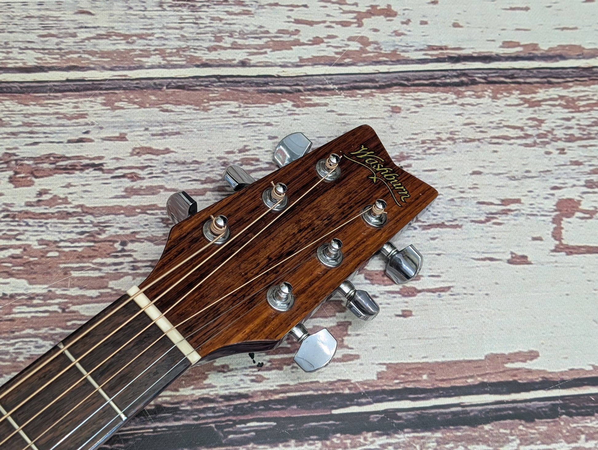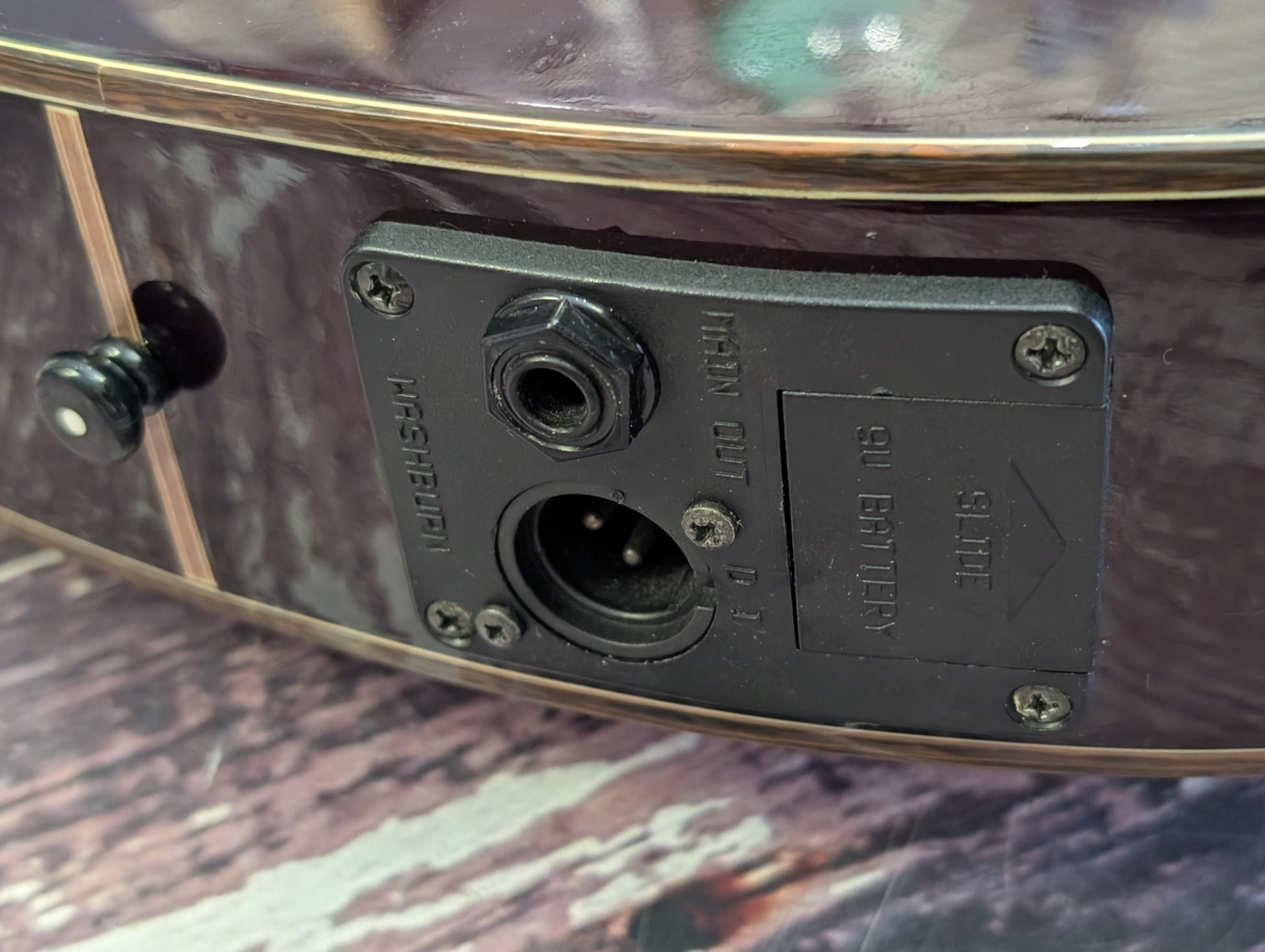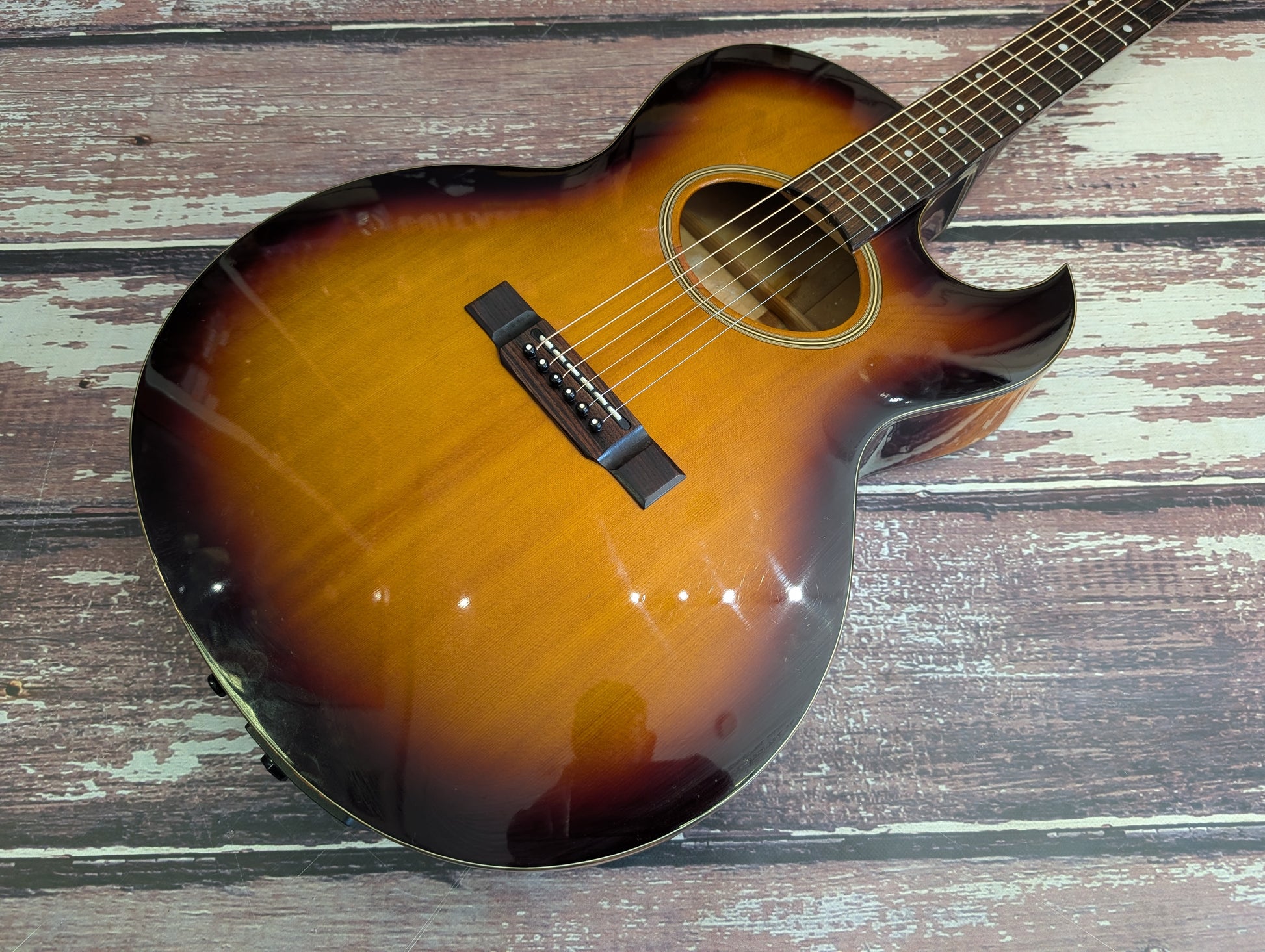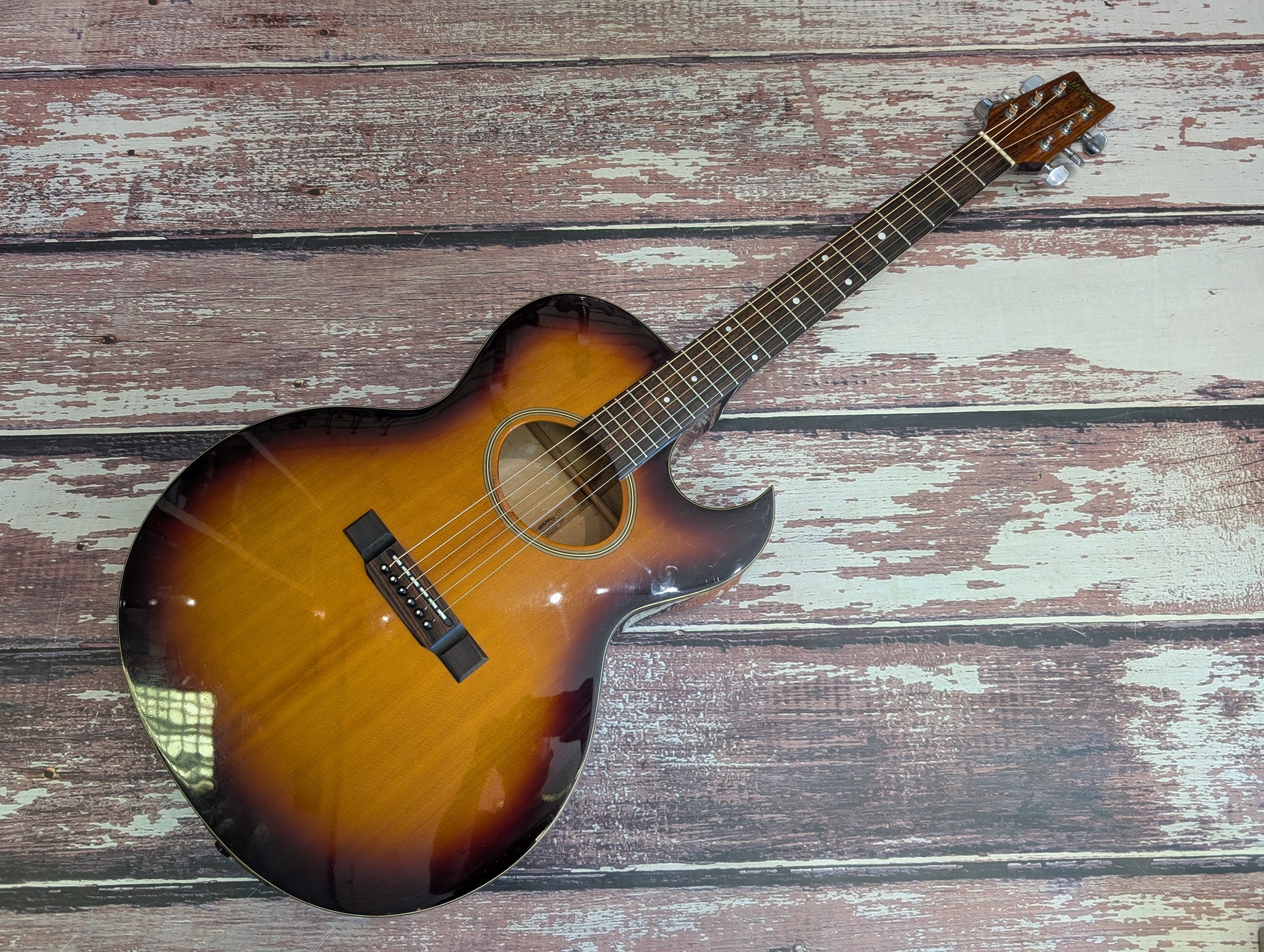 The EA range from Washburn are larger bodied Japanese acoustics. This particular one is an EA40, an electro in a Tobacco Sunburst finish with a Florentine cutaway. It has a solid Spruce top, with Birdseye Maple back and sides, and a maple neck with Rosewood board. The sound is punchy and spanky, with not quite as much low end as you'd typically get from a Jumbo size, owing to the shallow body, which also reduces the weight from what you'd expect of a guitar in this shape!
