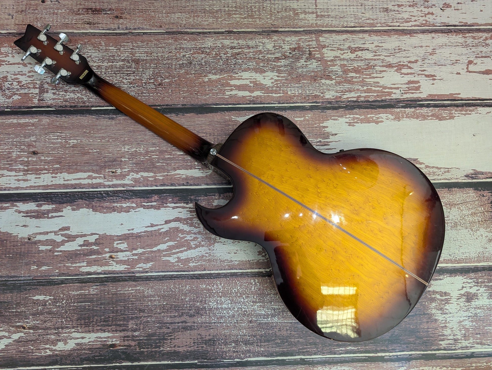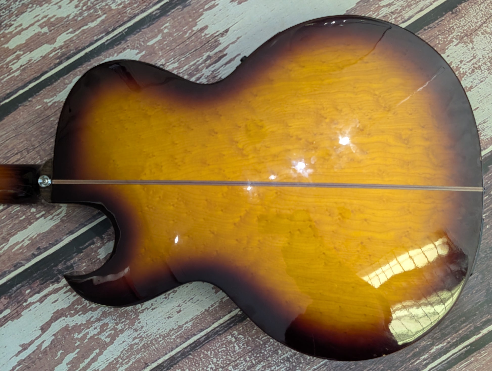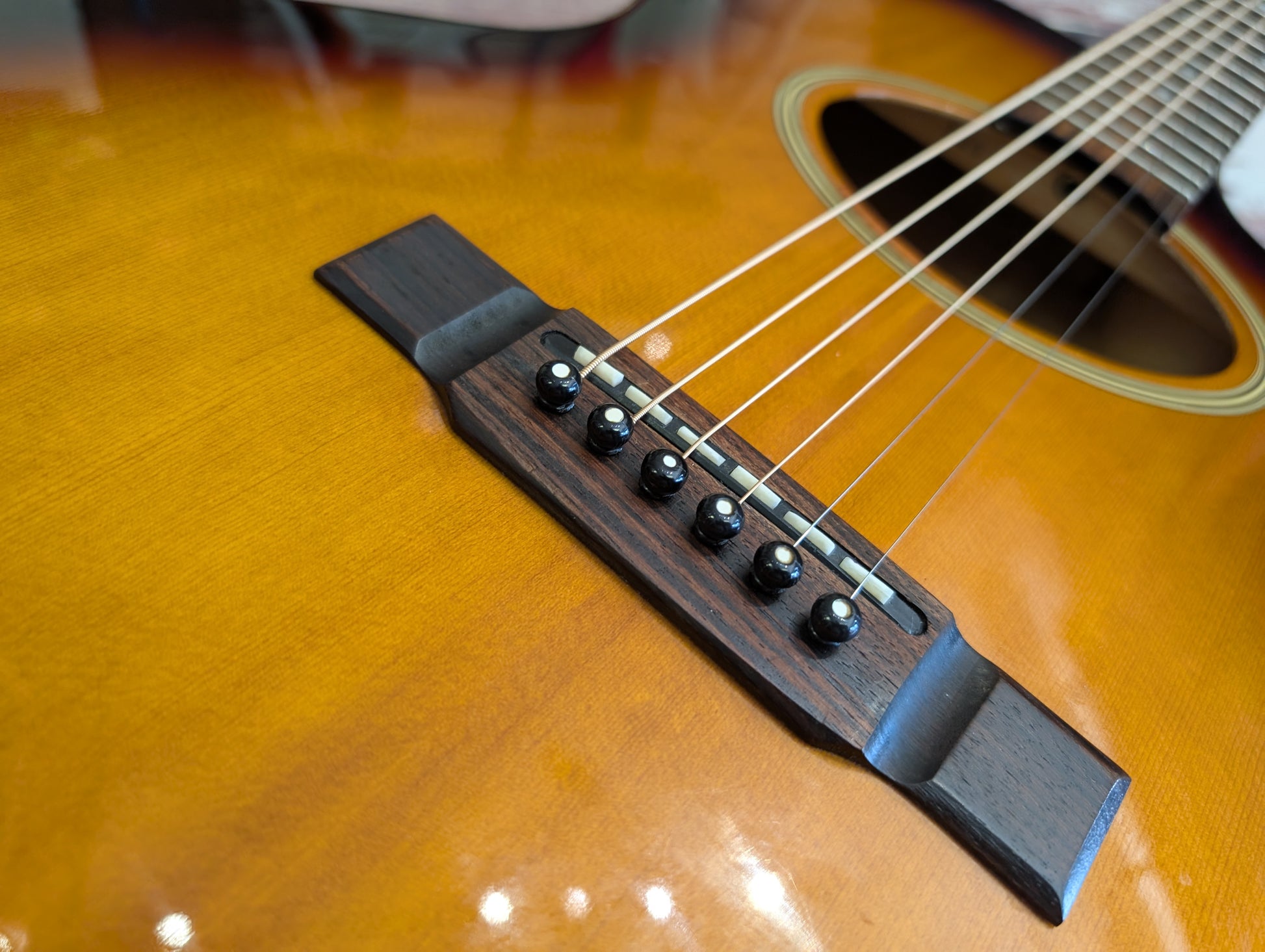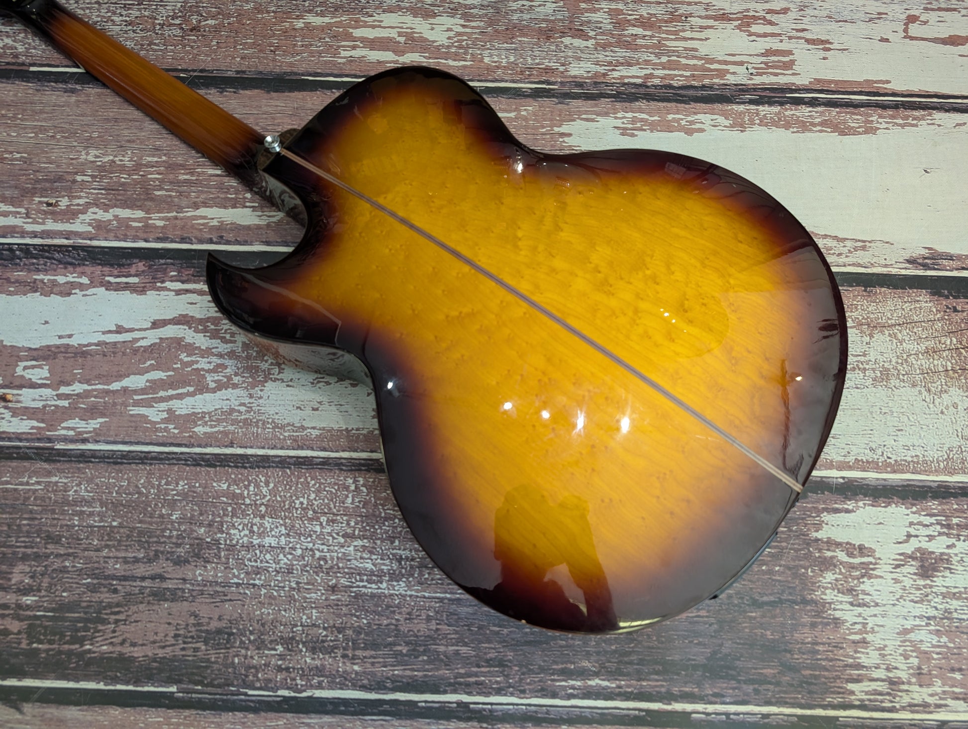 The EA range from Washburn are larger bodied Japanese acoustics. This particular one is an EA40, an electro in a Tobacco Sunburst finish with a Florentine cutaway. It has a solid Spruce top, with Birdseye Maple back and sides, and a maple neck with Rosewood board. The sound is punchy and spanky, with not quite as much low end as you'd typically get from a Jumbo size, owing to the shallow body, which also reduces the weight from what you'd expect of a guitar in this shape!