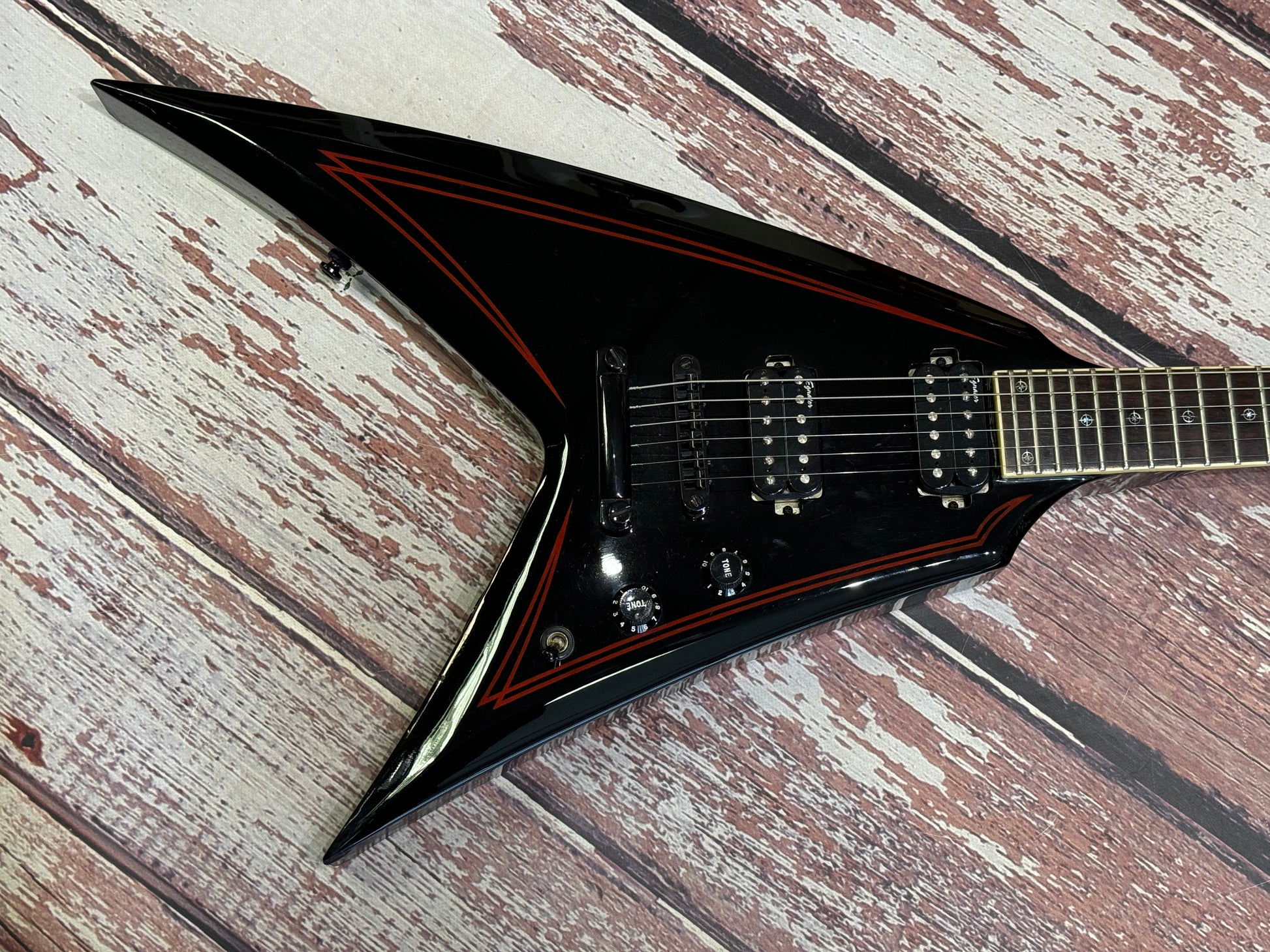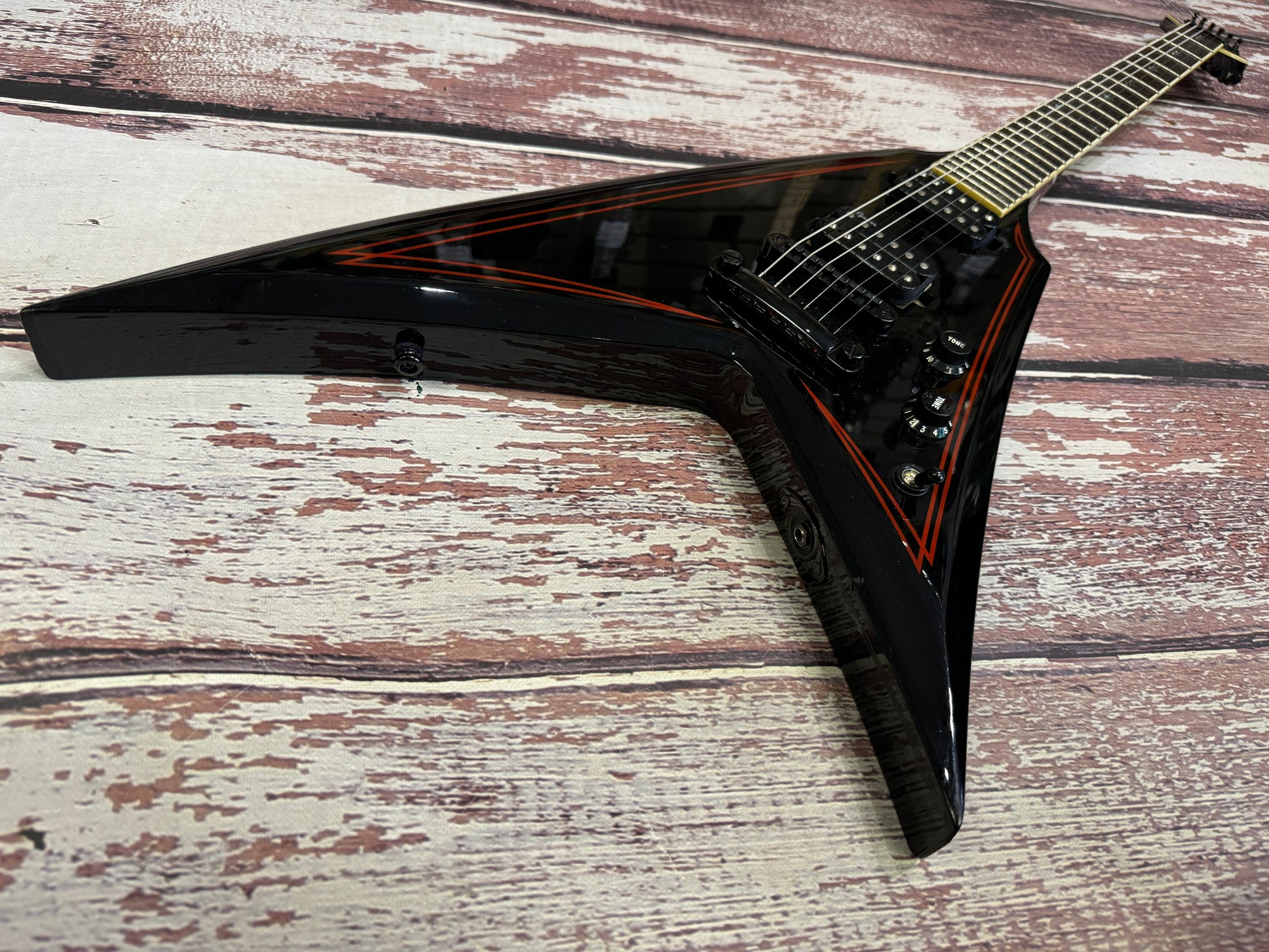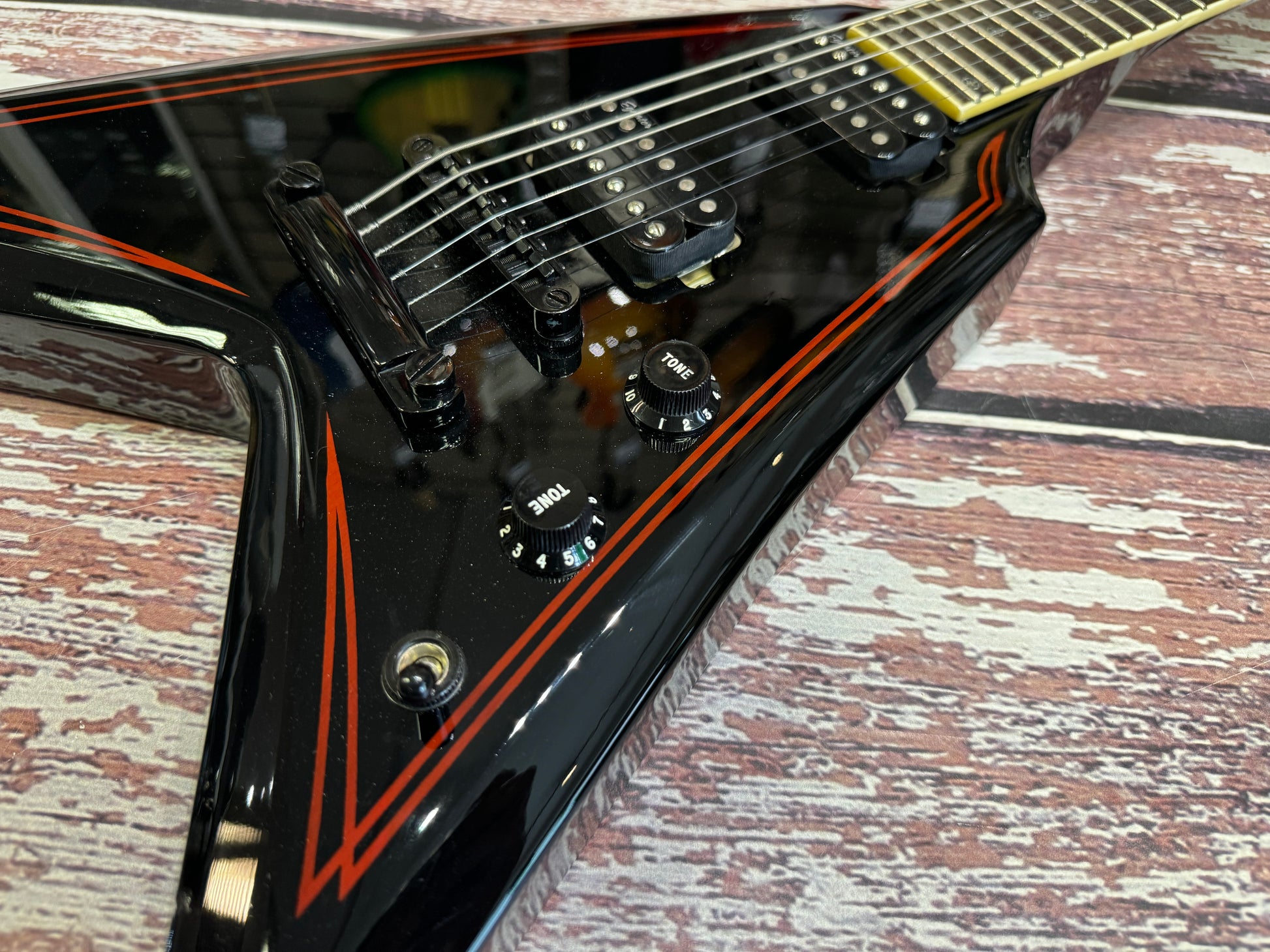 Looking suspiciously like a Randy Rhodes "V", this was the Vindicator model from Washburn. These were around in the early 2000's and fast became a metal favourite, combining extreme looks with a pair of Egnator humbuckers, single volume and tone and a 3 way pickup selector.
