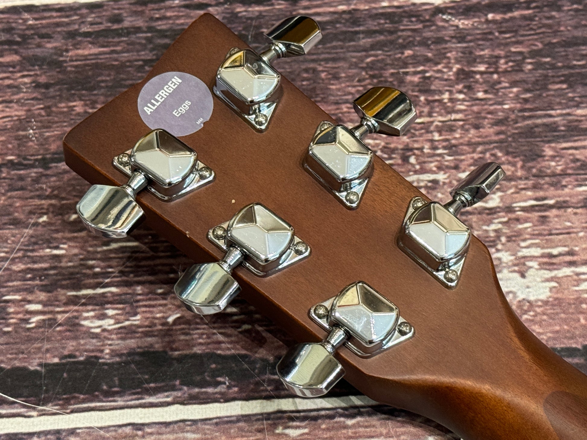 Here is a nice little starter or "knock around" acoustic, a dreadnought body that delivers a full deeper tonal range, just set up and cleaned and its ready to go,