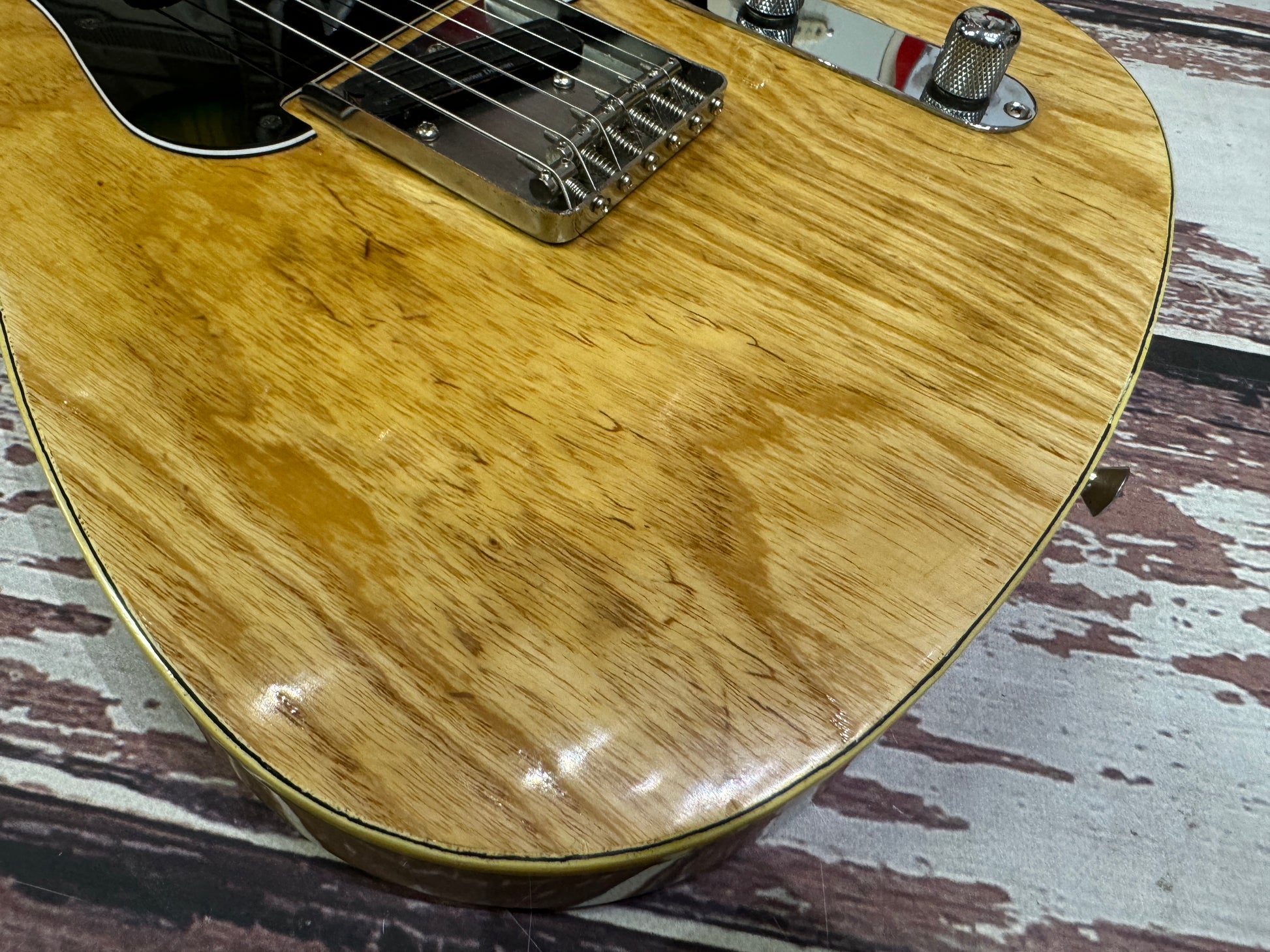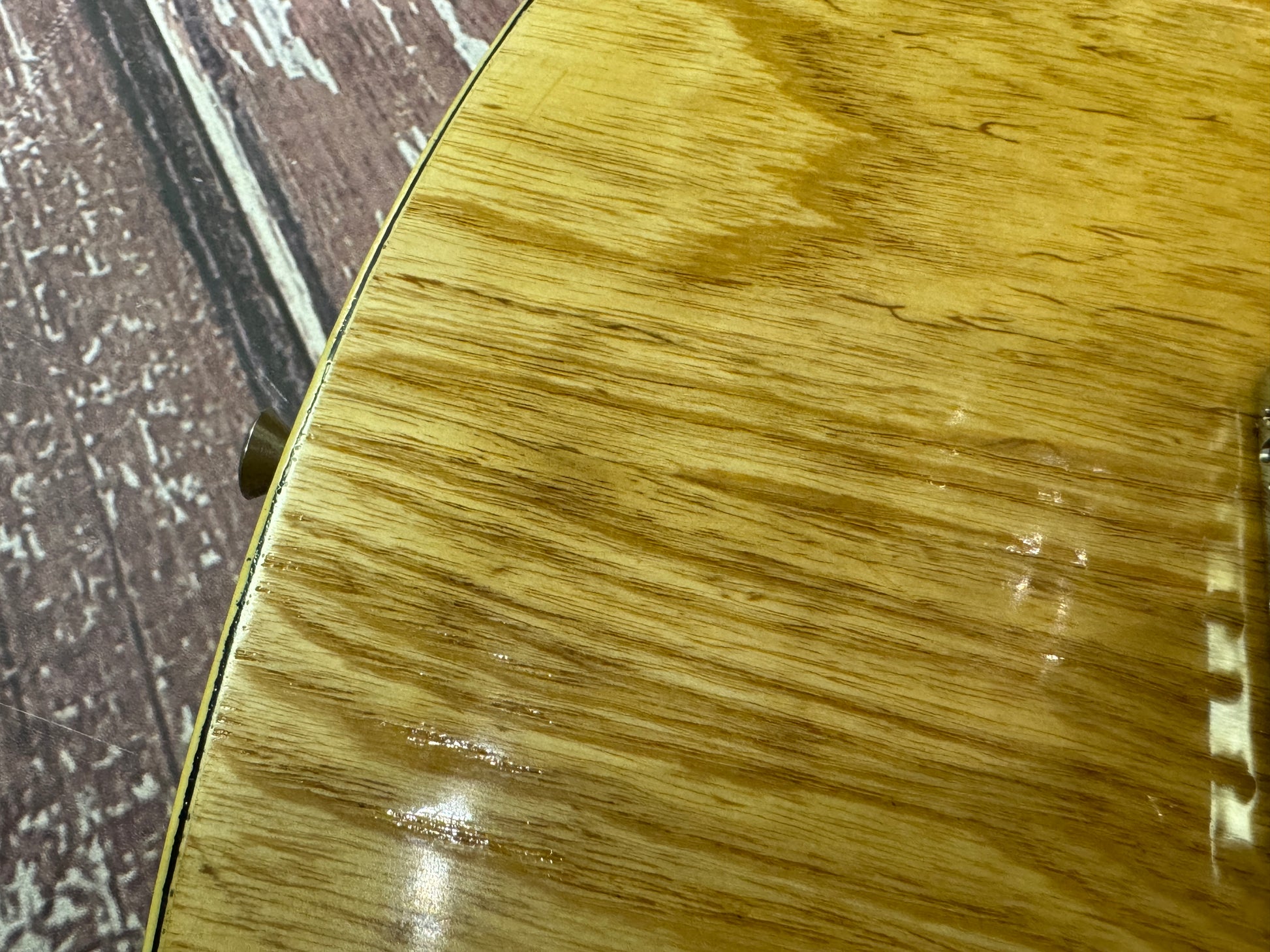This guitar arrived with a marked top, from a named player. It has stickers on the top for years then, they were removed leaving stains in the lacquer. As a result I have painstakingly stripped the original finish and hand oiled it with gun stock oil. This has taken 12 coats, all hand rubbed and hand finished to a glorious high sheen. I have worked in sympathy with the fabulous ash and not coated it so think that all the contours are lost, these are still visible when tilting the guitar in the light.