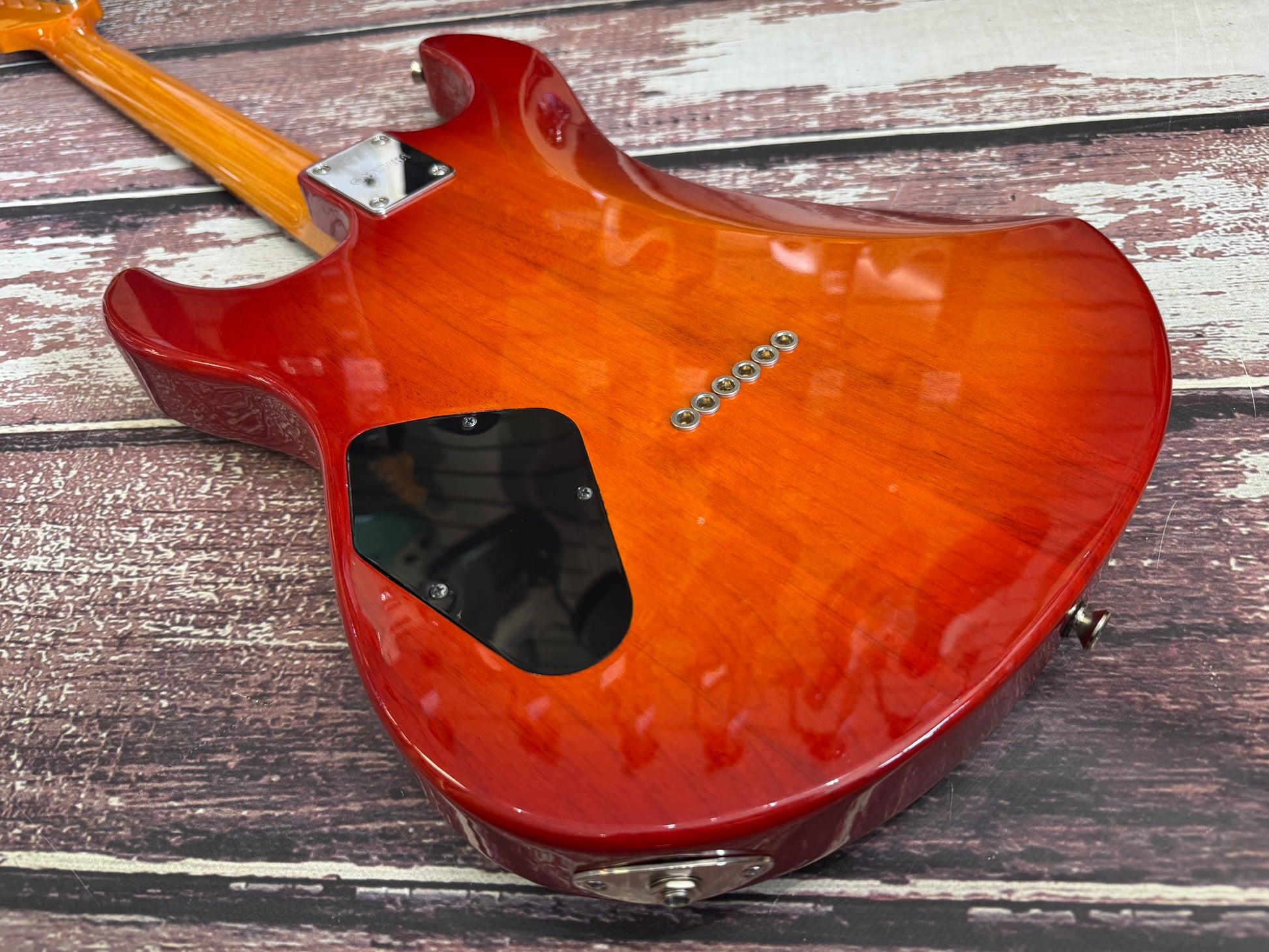 This is a Yamaha Pacifica 611HFM in Light Cherry Burst, it is a versatile electric guitar that combines high-quality components with elegant aesthetics. It features a solid alder body with a flamed maple top, providing a balanced and resonant tone. The maple neck and rosewood fingerboard offer smooth playability and comfort.